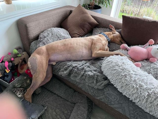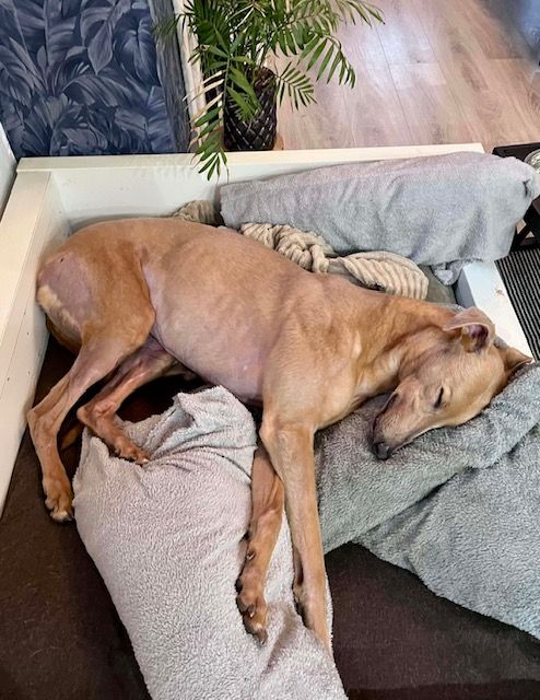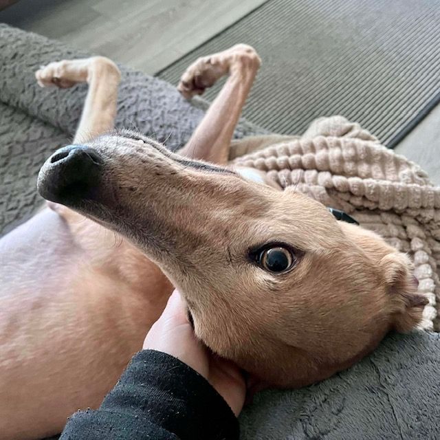 Oscar is currently in foster with another female Greyhound and is looking for his forever home. He would be happy as an only dog or with another Greyhound.
